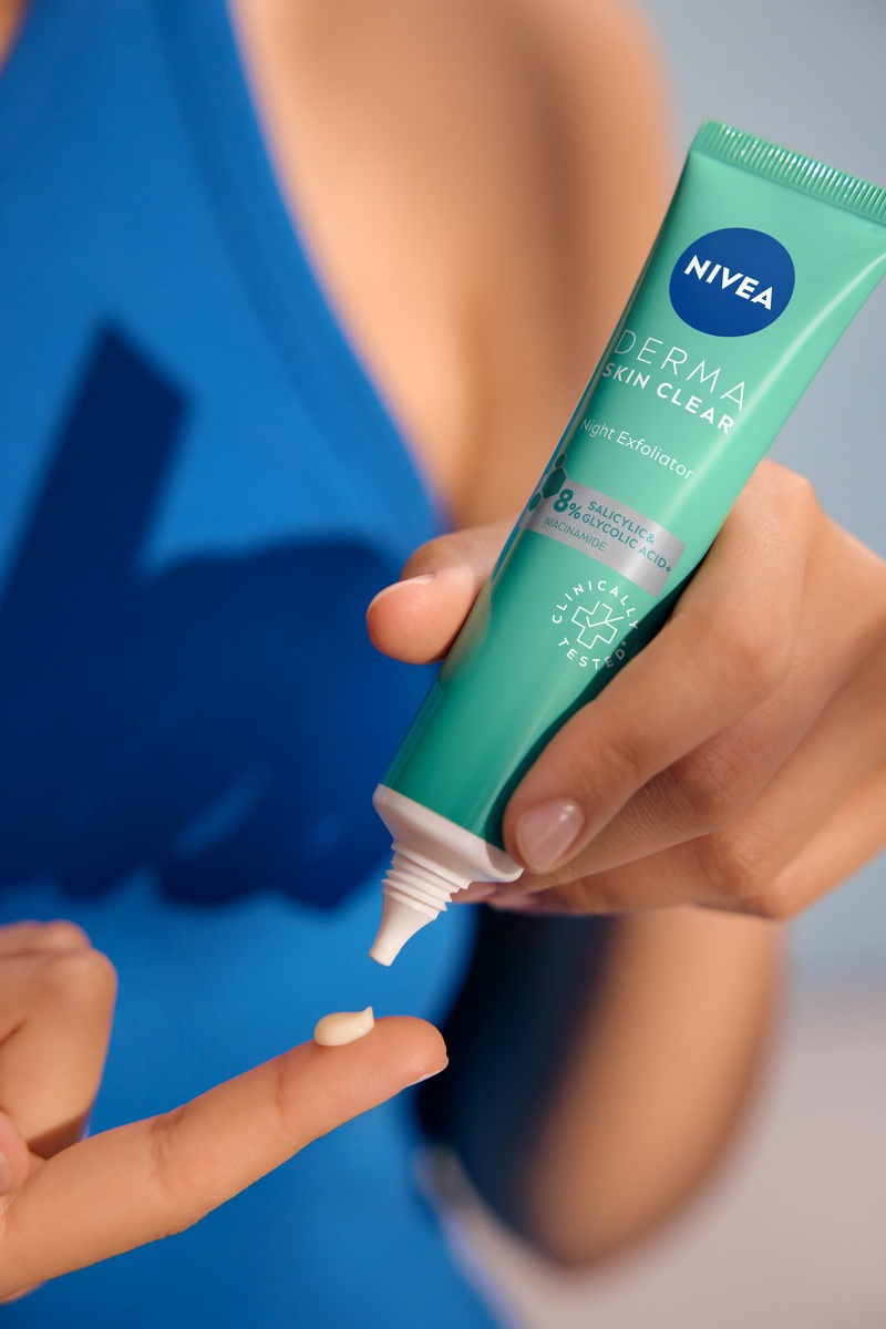 Održavajte redovnu eksfolijaciju za kontinuiranu prevenciju urasle dlake. Birajte eksfolijatore sa salicilnom ili glikolnom kiselinom, poput NIVEA Derma Skin Clear hemijskog eksfolijatora. Oslanja se na salicilnu kiselinu, glikolnu kiselinu i niacinamid u antibakterijskoj formuli kako bi podržao prirodni proces obnavljanja kože.