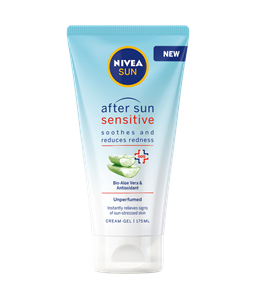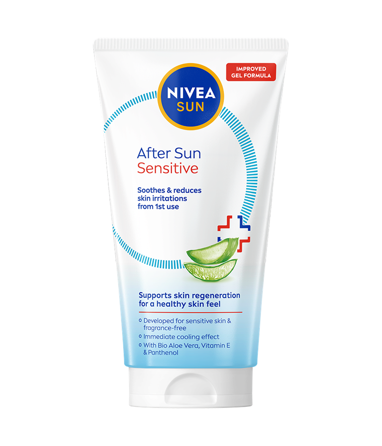 Trenutno umiruje, smanjuje iritacije i podržava regeneraciju osetljive kože nakon sunčanja – za nežno umirenje kože i zdrav, revitalizovan osećaj: NIVEA After Sun Sensitive gel za negu posle sunčanja.