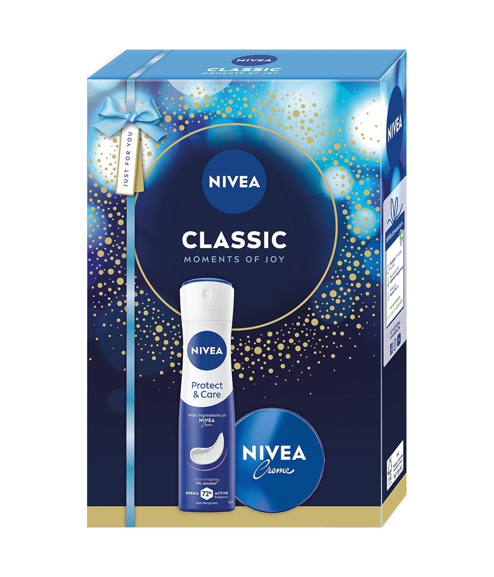 NIVEA CLASSIC CARE praznični poklon set idealan je za sve koji vole pouzdanu i svakodnevnu negu. Poklon set sadrži NIVEAProtect & Care dezodorans u spreju za osećaj svežine tokom celog dana i NIVEA univerzalnu kremu za negu lica, tela i ruku – praktičan izbor za svakodnevnu rutinu nege.