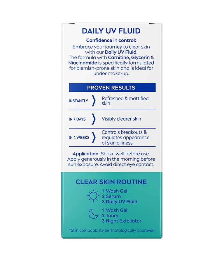 Održite svoje samopouzdanje pod kontrolom uz NIVEA® Derma Skin Clear dnevni UV fluid sa SPF 50+ koji vašoj koži pruža svakodnevnu zaštitu i negu. Kreiran je posebno za kožu sklonu nepravilnostima, formulacija je obogaćena karnitinom, glicerinom i niacinamidom. Obezbeđuje mat efekat do 8h, ne zapušava pore i sprečava nastanak bubuljica.
