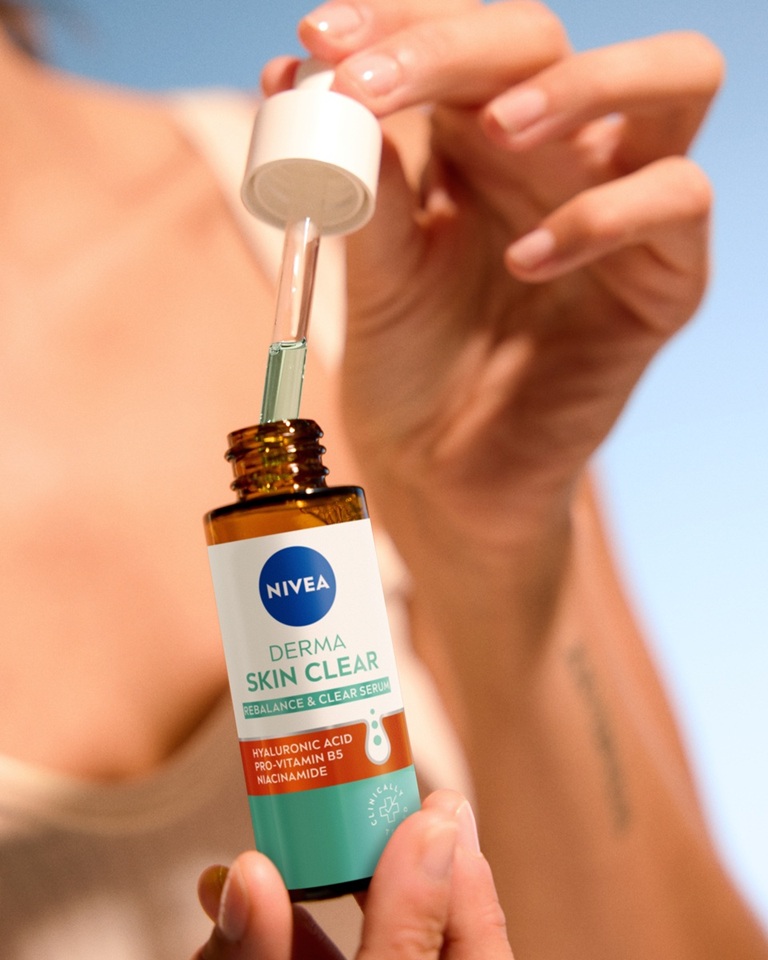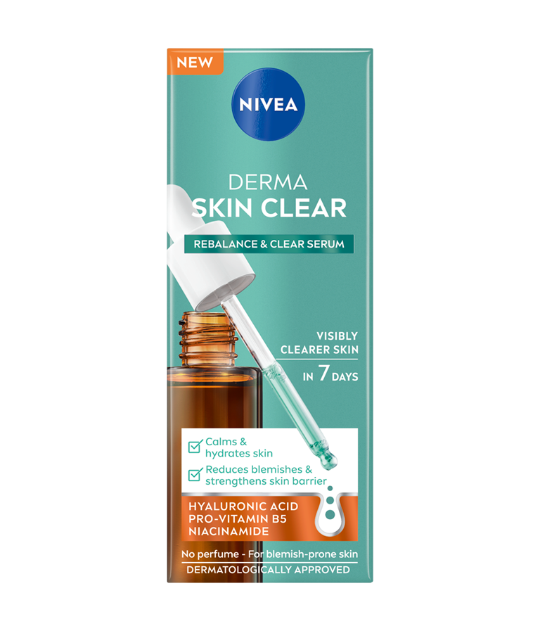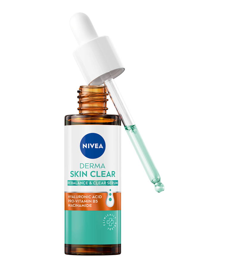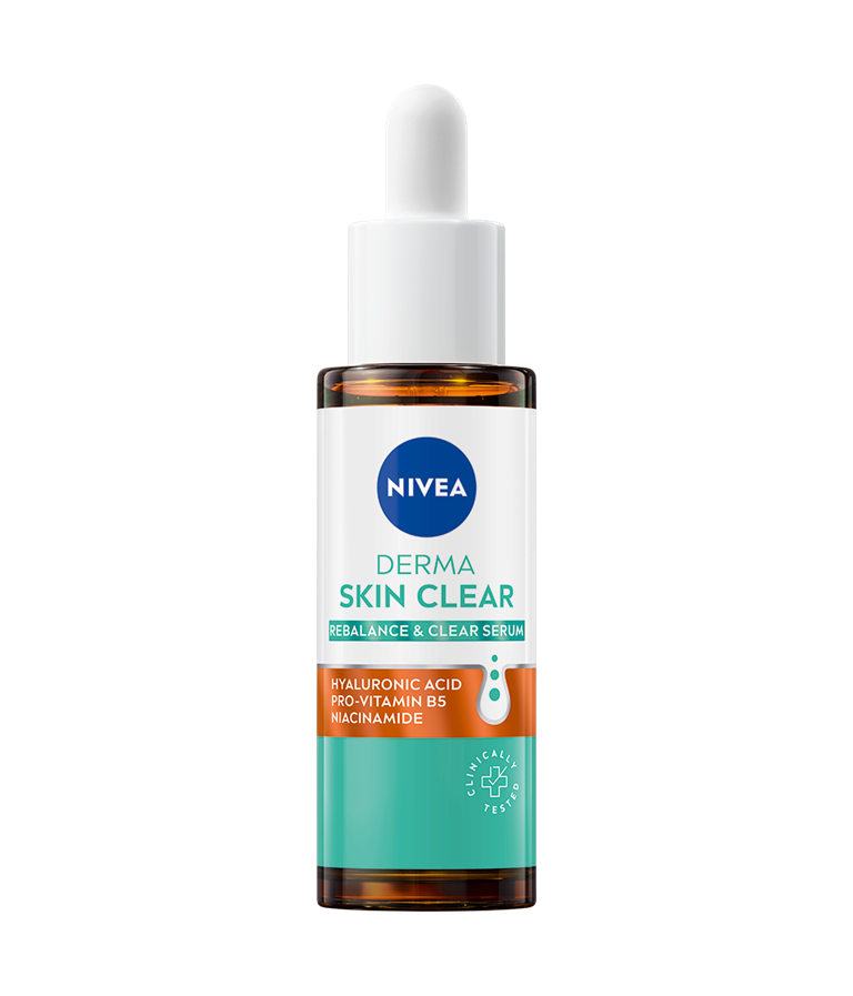 Poboljšajte svoju rutinu protiv fleka pomoću NIVEA Derma Skin Clear Rebalance & Clear seruma, sa formulacijom koja umiruje, hidrira, jača barijeru kože i smanjuje nepravilnosti.