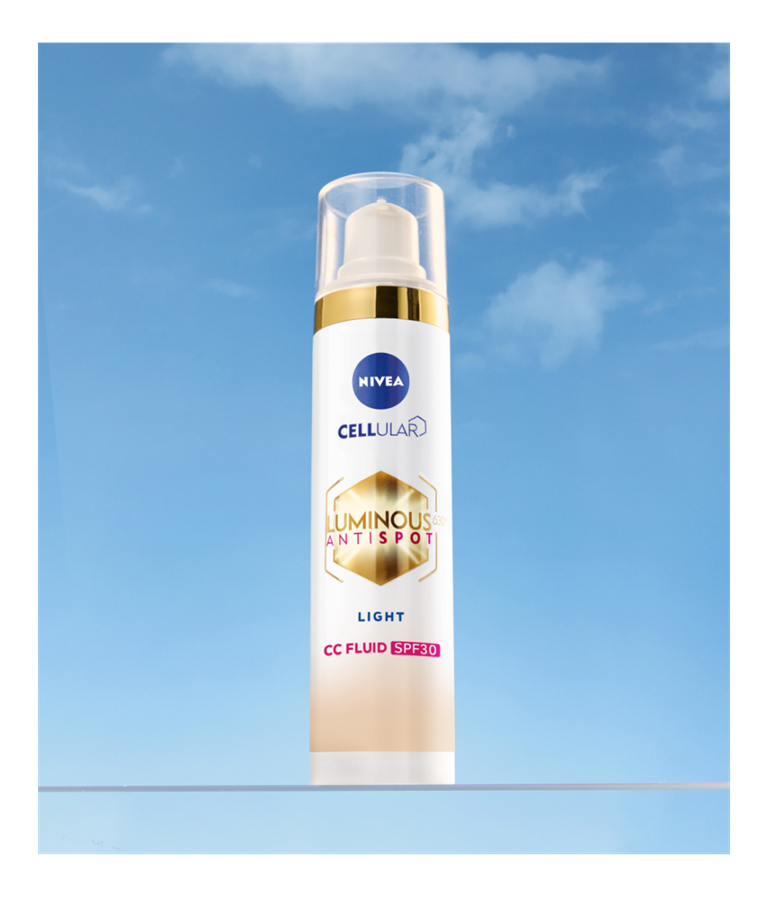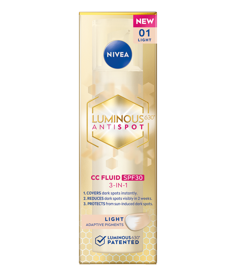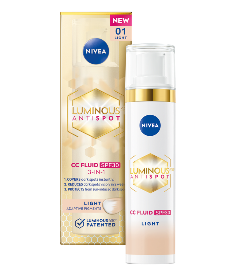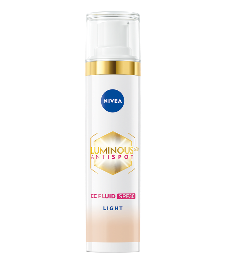 NIVEA LUMINOUS630® CC Fluid SPF30 3-u-1 prekriva, smanjuje i štiti od tamnih fleka - prvi vidljivi rezultati nakon 2 nedelje*. Sa pigmentima koji se prilagođavaju boji kože. Za ujednačenu, svetliju i blistavu kožu.