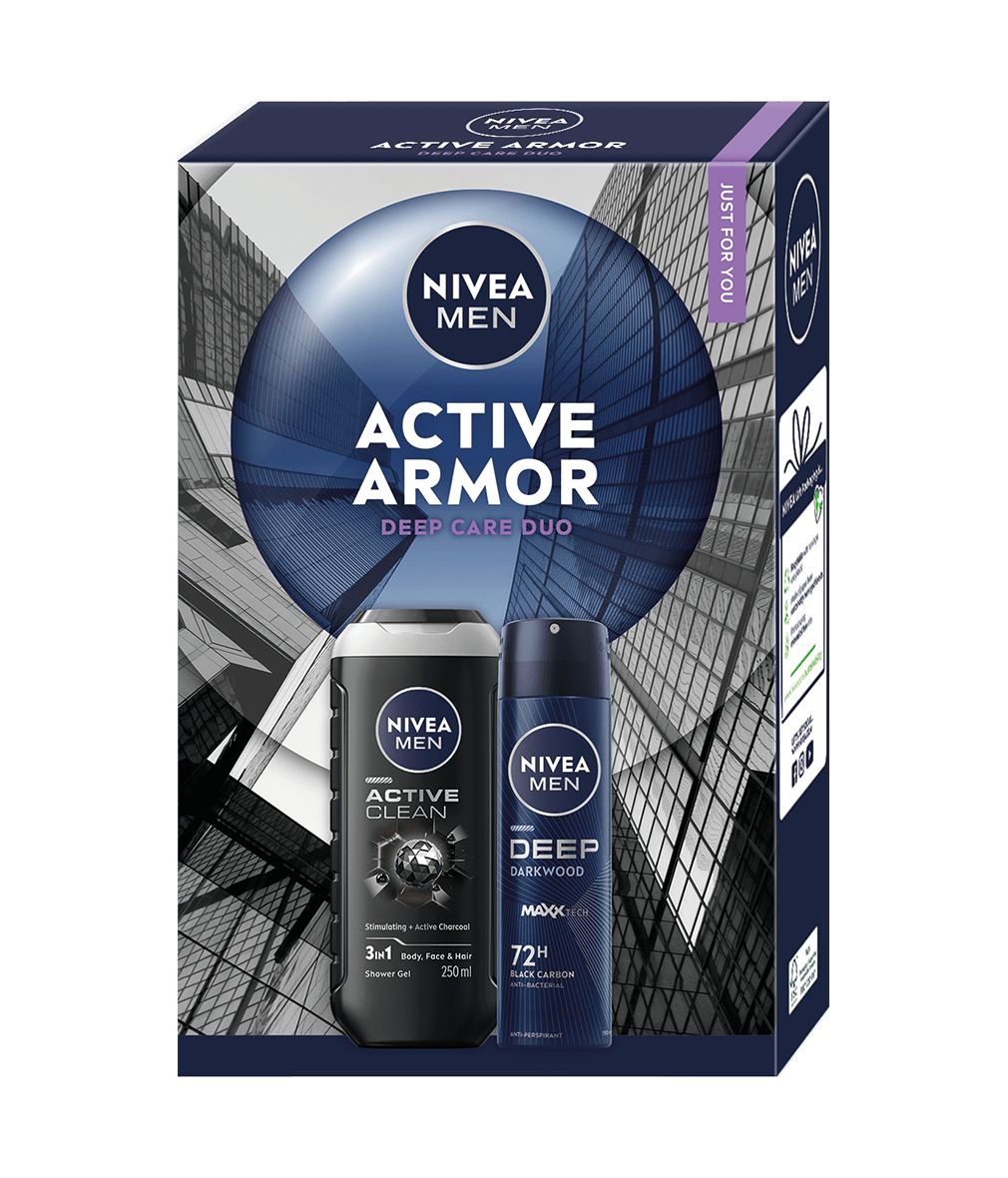 NIVEAMENACTIVE ARMOR praznični poklon set za aktivne muškarce sadrži NIVEAMENActive Clean gel za tuširanje i NIVEAMENDeep dezodorans u spreju koji pruža 48-časovnu zaštitu. Nega koja pruža osećaj svežine i muževni miris koji traje tokom celog dana!