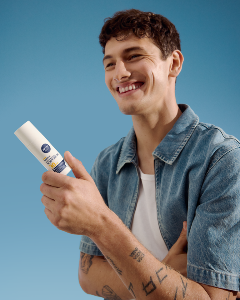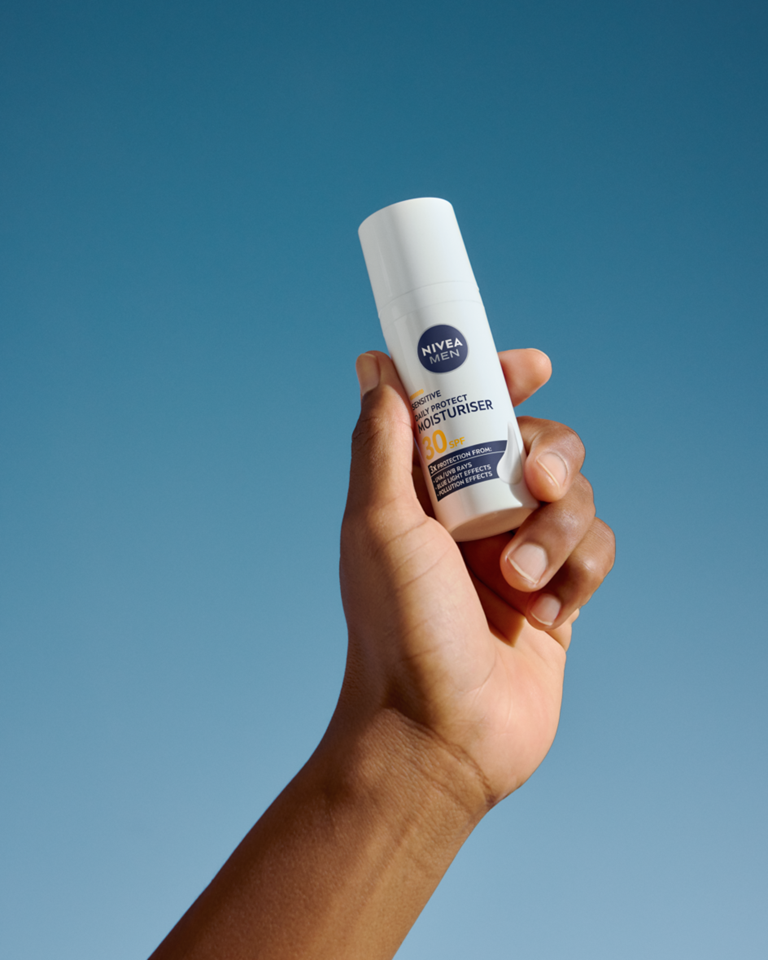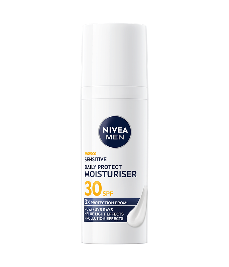 NIVEA MEN Sensitive Daily Protect hidratantna krema sa SPF30 pruža osetljivoj koži trostruku zaštitu od UVA/UVB zraka, plave svetlosti i zagađenja. Lagana, bez alkohola*, sa VitaminPRO kompleksom i antioksidansima – za hidriranu i zdravu kožu tokom celog dana.