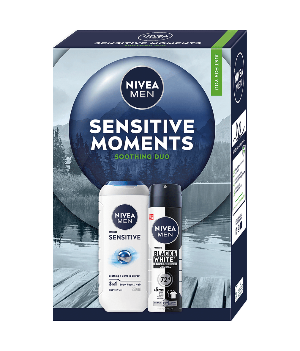 NIVEAMENSENSITIVE MOMENTS praznični poklon set je specijalno kreiran da pruži negu i zaštitu muškarcima sa osetljivom kožom. Poklon set sadrži NIVEAMENSensitive gel za tuširanje sa ekstraktom bambusa i NIVEAMENBlack & White Invisible dezodorans u spreju koji pruža osećaj svežine tokom celog dana i štiti odeću od fleka. Nega i zaštita u jednom poklonu!