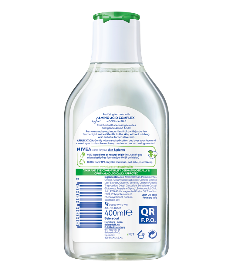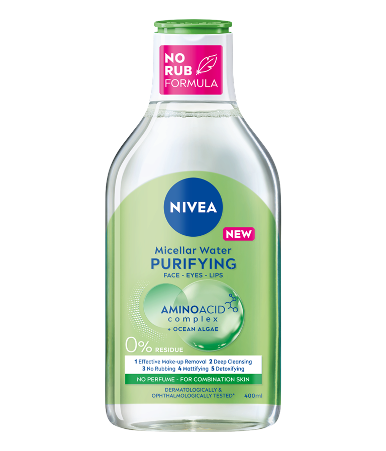 NIVEA pročišćujuća micelarna voda za kombinovanu kožu čisti, uklanja šminku, matira i detoksifikuje kožu, bez ostataka. Formulacija sa kompleksom aminokiselina i okeanskim algama efikasno i nežno uklanja šminku i nečistoće u samo nekoliko laganih pokreta, bez potrebe za trljanjem.