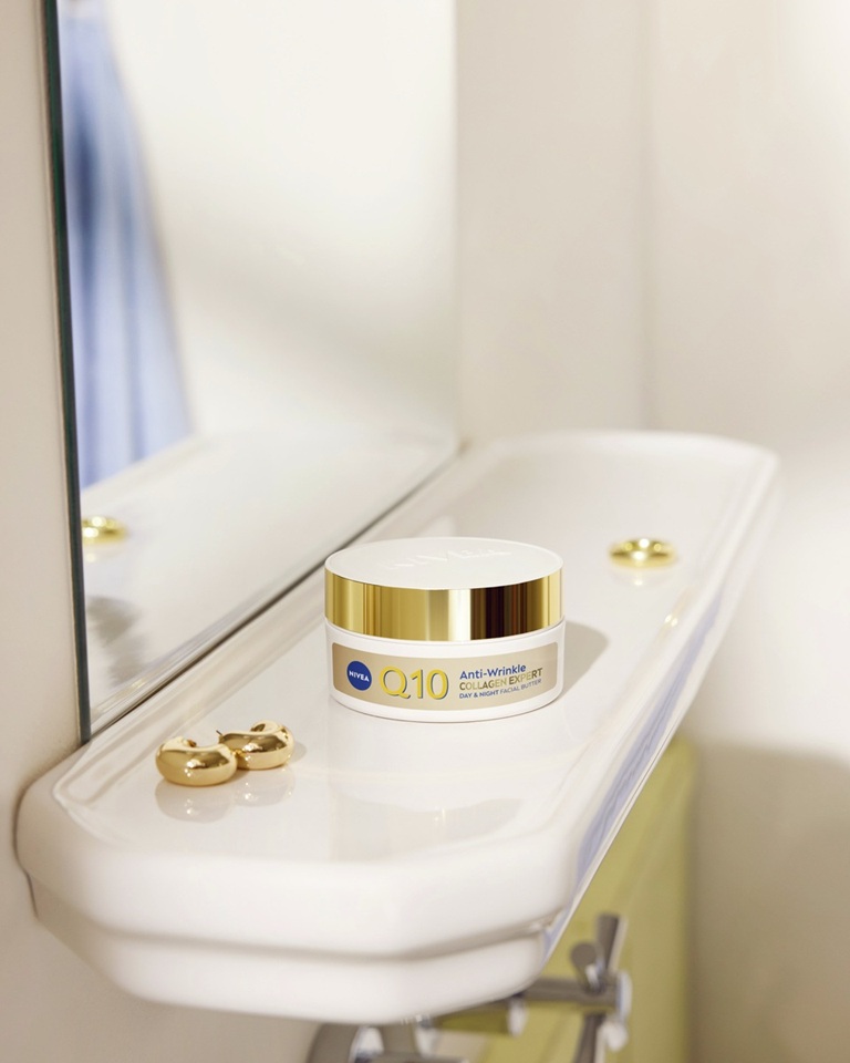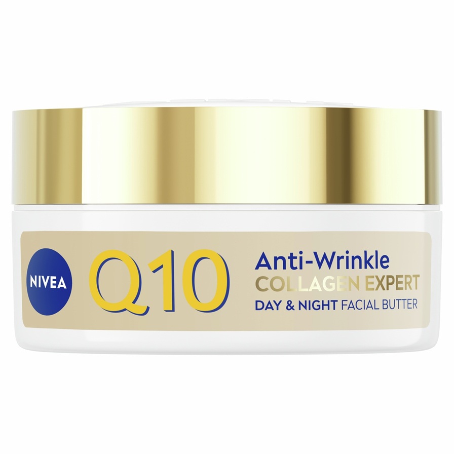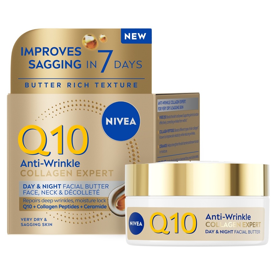Učvršćuje i definiše konture lica za zaglađeniji ten već za 2 nedelje. Bogata, puterasta formulacija sa čistim Q10, peptidima kolagena i ceramidom pruža dubinsku negu i zaključava vlagu do 72 sata: NIVEA Q10 Anti-Wrinkle Collagen Expert puter za lice za dnevu i noćnu negu.