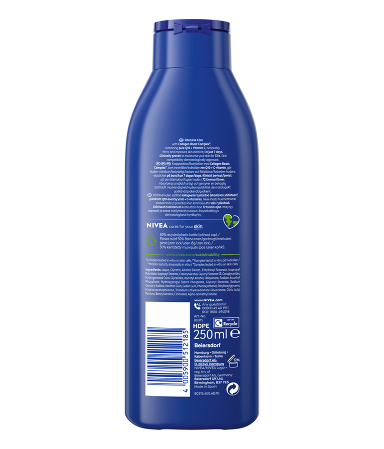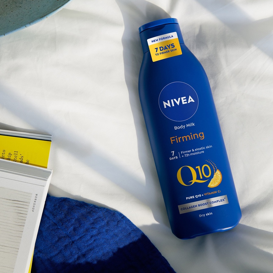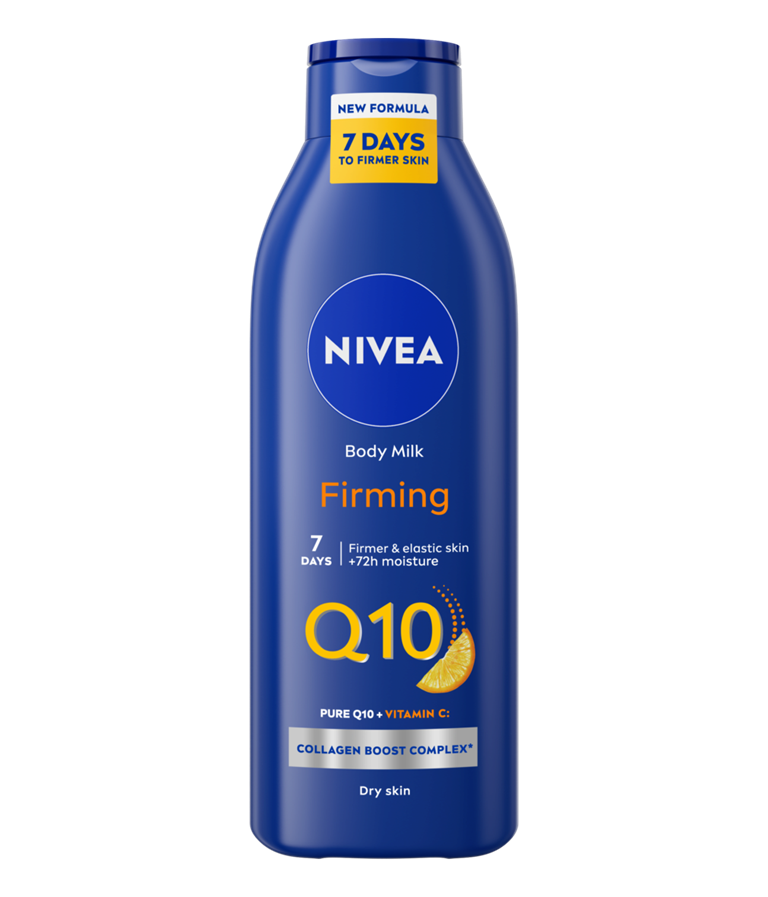 Uživajte u čvrstoj i elastičnoj koži! NIVEA Q10 mleko za učvršćivanje kože sa kompleksom pojačivača kolagena* koji sadrži čisti Q10 i vitamin C, primetno učvršćuje i poboljšava elastičnost kože za 7 dana, ostavljajući je hidriranom tokom 72 sata – klinički dokazano. dokazano. *Testiran in-vitro na ćelijama kože.
