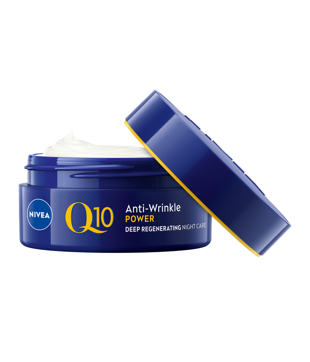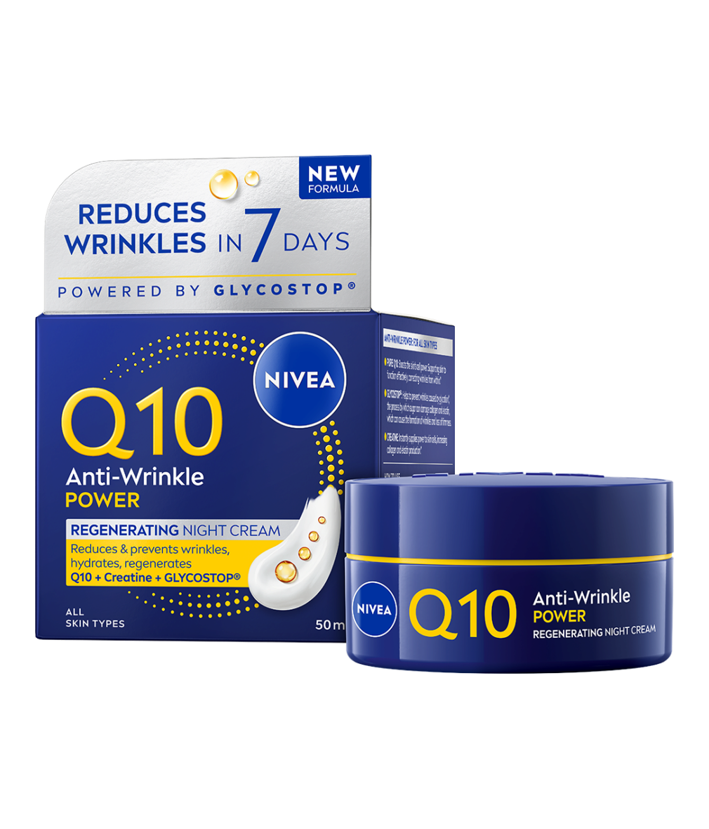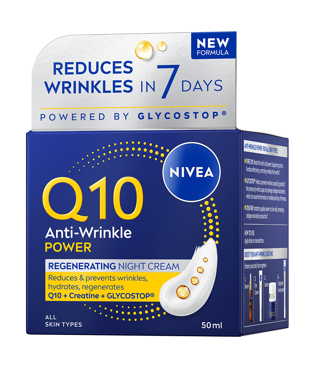 NIVEA Q10 Power noćna krema protiv bora obogaćena je koenzimom Q10 dvostrukog dejstva i kreatinom za 24-časovno delovanje protiv bora. Vidljivo čvršća koža i smanjenje bora za samo 7 dana.