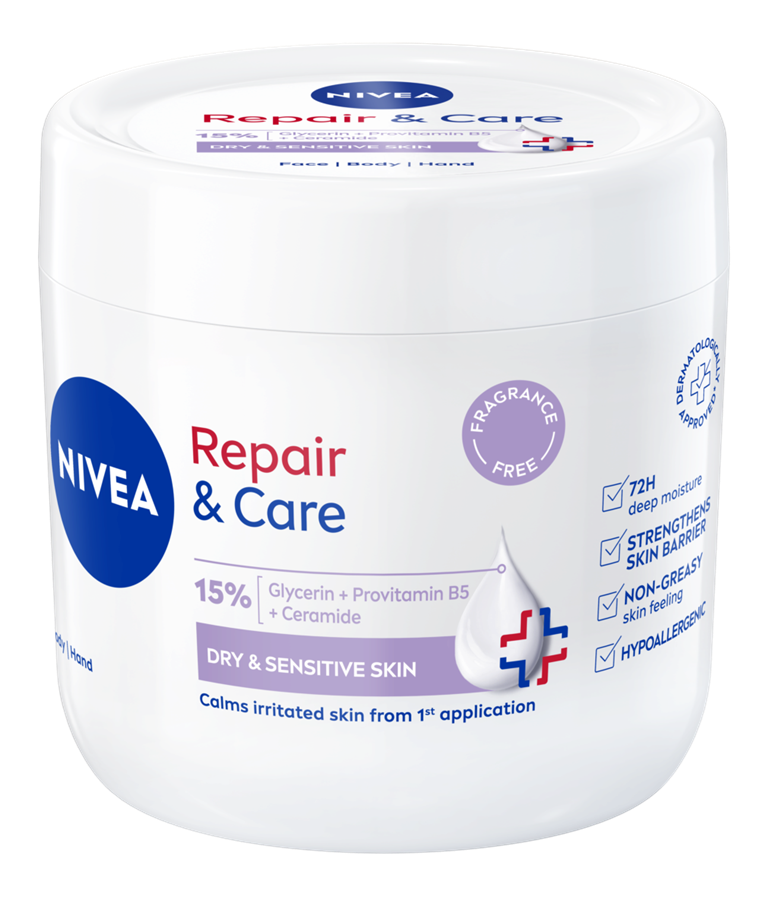 NIVEA Repair & Care univerzalna krema bez mirisa nežno umiruje suvu i osetljivu kožu. Njena hipoalergena formulacija, obogaćena sa 15 % glicerina, provitaminom B5 i ceramidima, pruža intenzivnu negu i umiruje iritiranu kožu već nakon prve upotrebe. Sigurna je i pogodna i za decu stariju od 3 godine.