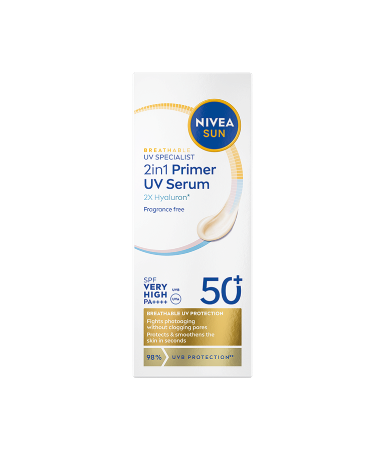 NIVEA Sun 2u1 PRIMER Daily UV serum za zaštitu kože lica od sunca SPF 50+ štiti od foto-starenja bez zapušavanja pora. Istovremeno štiti i zaglađuje kožu, produžavajući postojanost šminke.