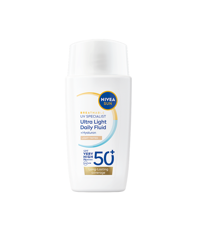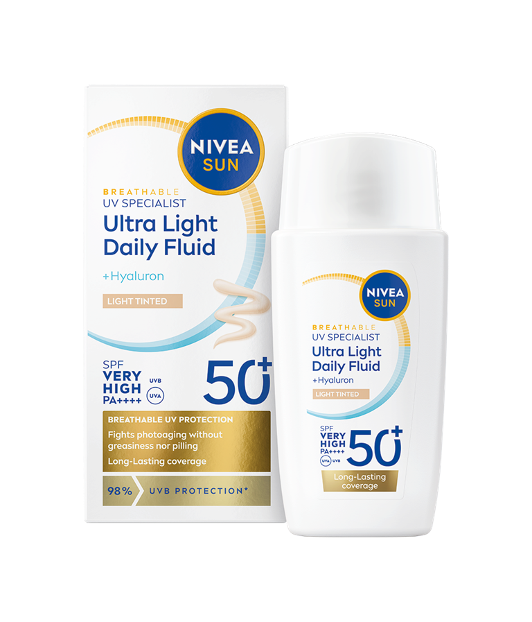 NIVEA SUN UV Face Specialist Invisible Daily ultralagani fluid svetle nijanse za zaštitu kože lica od sunca SPF 50+ štiti od foto-starenja, bez masnog osećaja i stvaranja grudvica. Hidrira kožu i prekriva nesavršenosti, pružajući prirodnu i dugotrajnu pokrivenost.