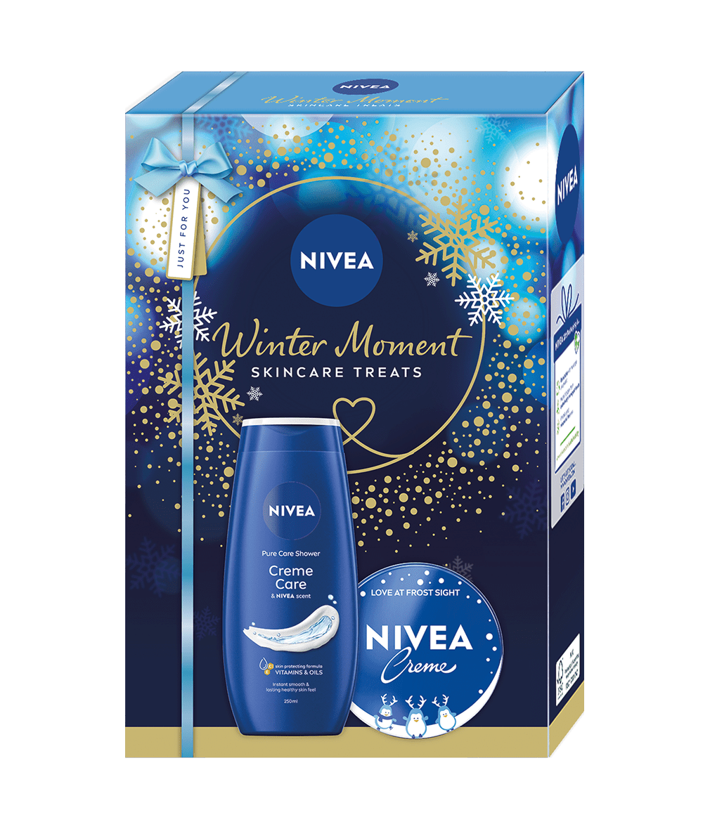 NIVEA WINTER MOMENT praznični poklon set za glatku i negovanu kožu. Poklon set sadrži NIVEACremeCare kremasti gel za tuširanje sa provitaminom B5 i negujućim uljima, kao i NIVEA univerzalnu kremu za negu lica, tela i ruku obogaćenu jedinstvenim NIVEA mirisom.