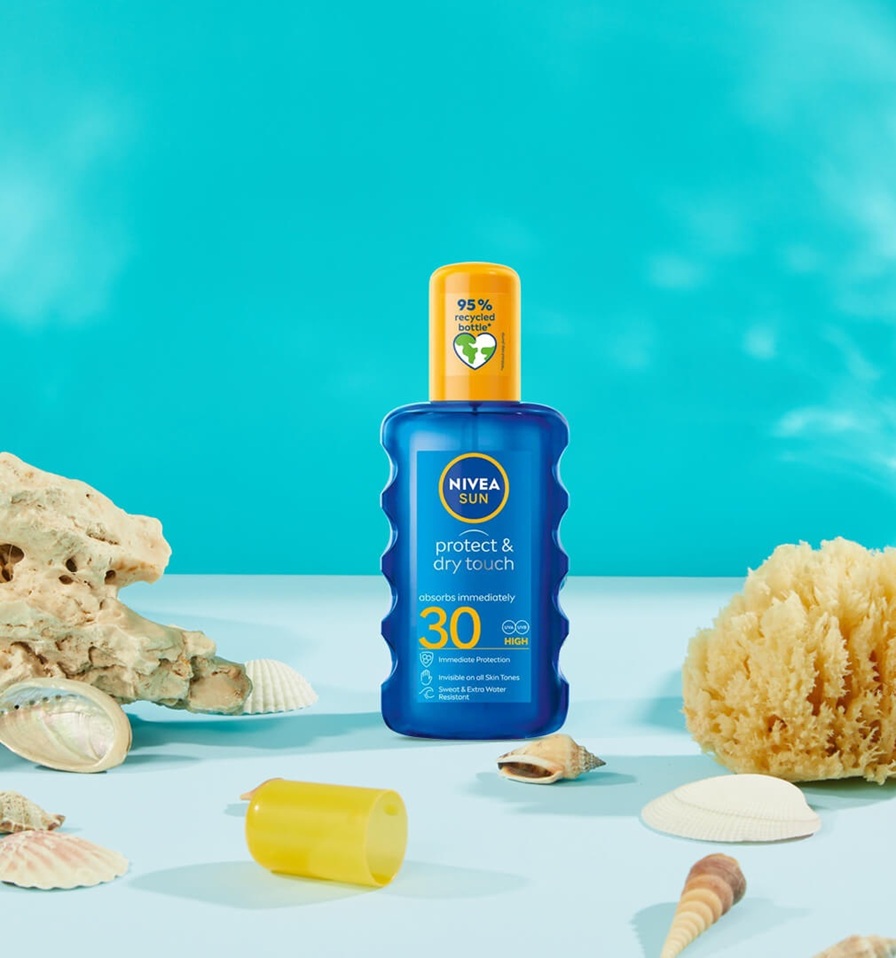 Trenutna zaštita od opekotina od sunca koja je nevidljiva na svim tonovima kože: NIVEA SUN Protect & Dry Touch nevidljivi sprej za zaštitu od sunca SPF 30.