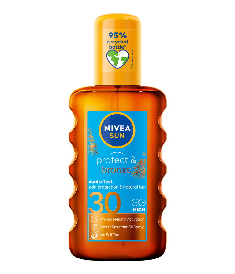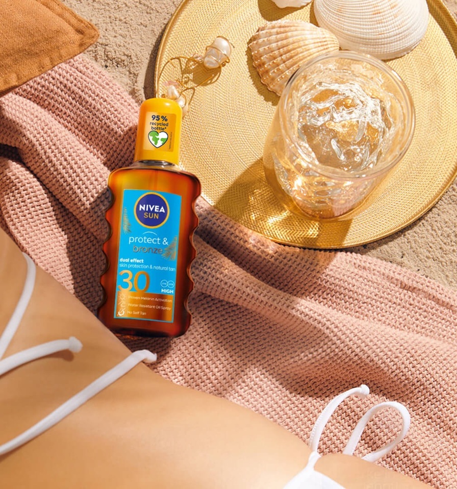 Zaštita od sunca za preplanuli i zdrav izgled kože. Dvostruki efekat: zaštita kože i prirodna preplanulost uz dokazanu aktivaciju melanina. NIVEA SUN Protect & Bronze ulje za zaštitu od sunca SPF 30.